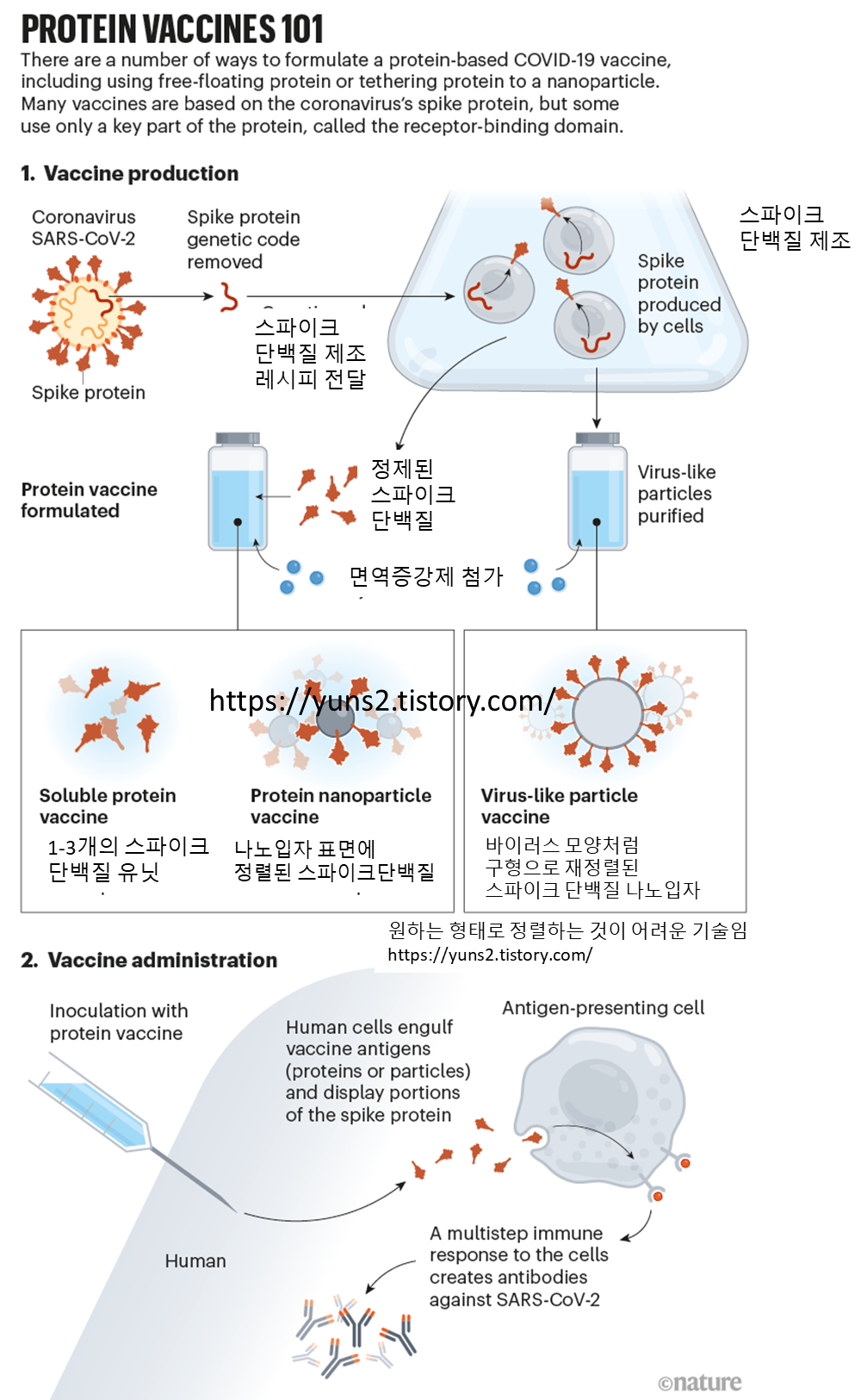 Companies know how to manufacture gobs of purified protein at scale — using genetically engineered cells from mammals, insects or microbes — but the process involves many steps, each of which has to be optimized for making a specific protein. “There’s an intrinsic slowness,” says Christian Mandl, a former industry executive who now consults on vaccine-development issues. Most of the protein-based vaccines currently in testing have been crafted around some version of the coronavirus SARS-CoV-2’s spike protein, which helps the virus to enter cells (see ‘Protein vaccines 101’).