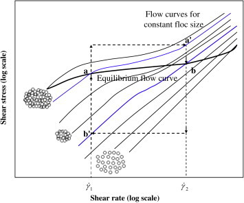 After Barnes, H. A.; Hutton, J. F.; Walters, K. An Introduction to Rheology; Elsevier: Amsterdam, The Netherlands, 1989.This is represented in a series of ‘flow curves’ in a diagram of shear stress against shear rate (3) (Figure 3). In this figure, point a corresponds to a shear rate γ˙1. At that point, the microstructure consists of a series of large flocs. If the shear rate is increased from γ˙1 to γ˙2, the flocs break up until the size corresponds to the flow curve that passes through point b. If the shear rate is then reduced back to γ˙1, the individual particles begin to collide with each other and agglomerate until an equilibrium size is reached, which is characteristic of the lower shear rate.