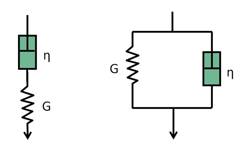 Figure 7 – (left) Maxwell model representative of a simple viscoelastic liquid; (right) Kelvin-Voigt model representative of a simple viscoelastic solid.