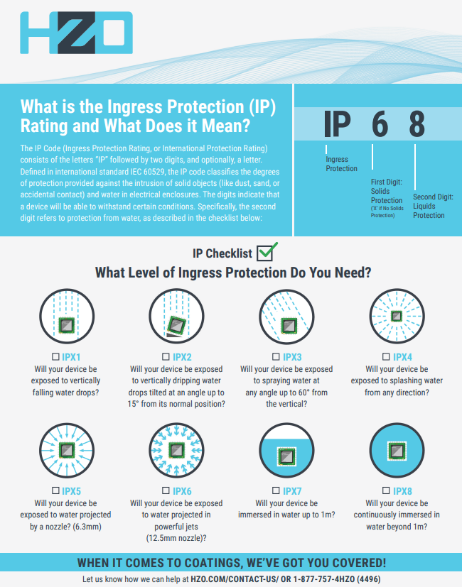 Defining “waterproof” is simple, but the concept is more complicated. Currently, there is no established industry standard to classify a device as waterproof. The closest thing currently available, as far as a rating scale is concerned, is the Ingress Protection Rating scale (or IP Code). The IP Code assigns items a rating from 0-8 in terms of how effective the device is at keeping water from entering into it, a process called the ingress of water. Obviously, there is one major flaw in this rating system: What about companies, like us here at HZO who are not concerned about keeping water out of a device in order to save it from water damage? Our coatings allow water inside devices, but the waterproof material we coat the devices with protects them from any possibility of water damage. HZO’s services have a different intention than the effect the IP scale can measure. Still, our coatings help you protect your electronic devices from water damage.