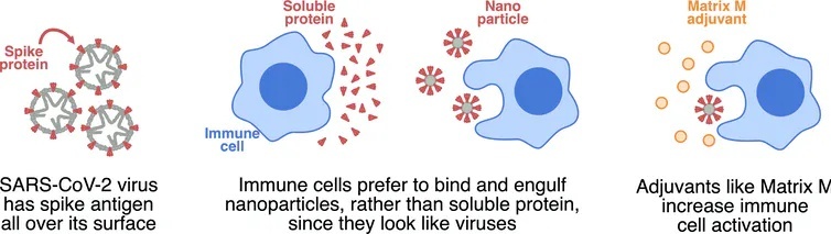 먼저 이 백신은 면역증강제(adjuvant)를 첨가해 사용하는 펩타이드 기반의 전통적인 백신입니다. 그러나 기존의 펩타이드 백신과는 달리 나노파티클이라는 기술을 이용하였고, 면역증강제도 Matrix-M이라고 새롭게 개발해서 사용하고 있습니다.