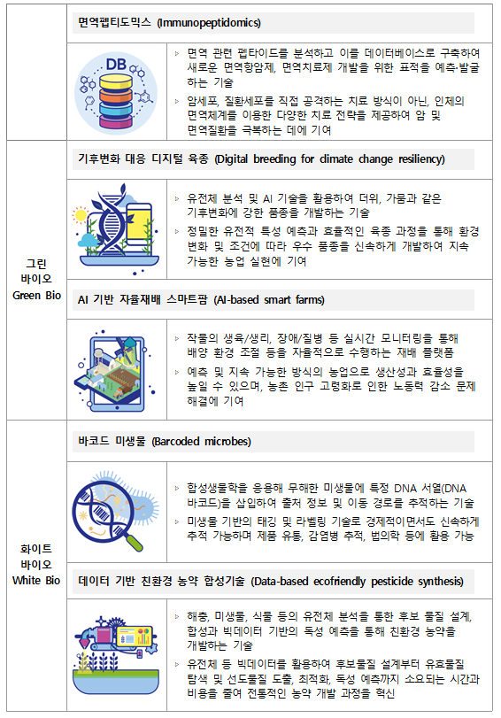- 차세대 롱리드 시퀀싱(플랫폼바이오), 마이크로바이옴 표적 항암백신(레드바이오), 기후변화 대응 디지털 육종(그린바이오), ...