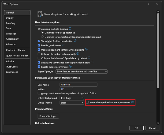 - 파일 > 옵션 > 일반 > Microsoft Office 복사본 개인 설정 으로 이동합니다.