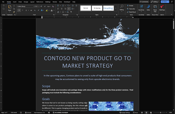 Word 어두운 모드는 메뉴 컨트롤과 문서 배경 모두에 어두운 색 구성표를 제공합니다. 어두운 모드는 눈의 피로를 줄이는 데 도움이 될 수 있으며 Word 더 현대적인 느낌을 제공합니다. 어두운 페이지 배경은 문서를 인쇄하는 방법을 전달하지 않거나 공동 작업자가 문서를 열 때 표시되는 기본 보기를 전달하지 않습니다.